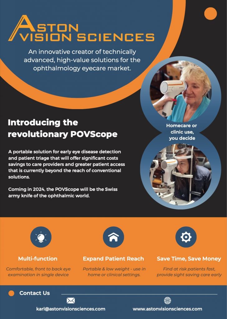 Introducing POVscope by Aston Vision Sciences Ltd Posted March 11, 2023 VisionBridge CIC continues to support the development of solutions that are more cost-effective, time-efficient and portable for healthcare professionals and which will provide even better outcomes for patients. For all eye health professionals exhibiting or visiting 100% Optical (25-27 February in ExCeL London), come and meet the inventor Karl Obszanski from Aston Vision Sciences Ltd on the Sight and Sound Technology stand B69.